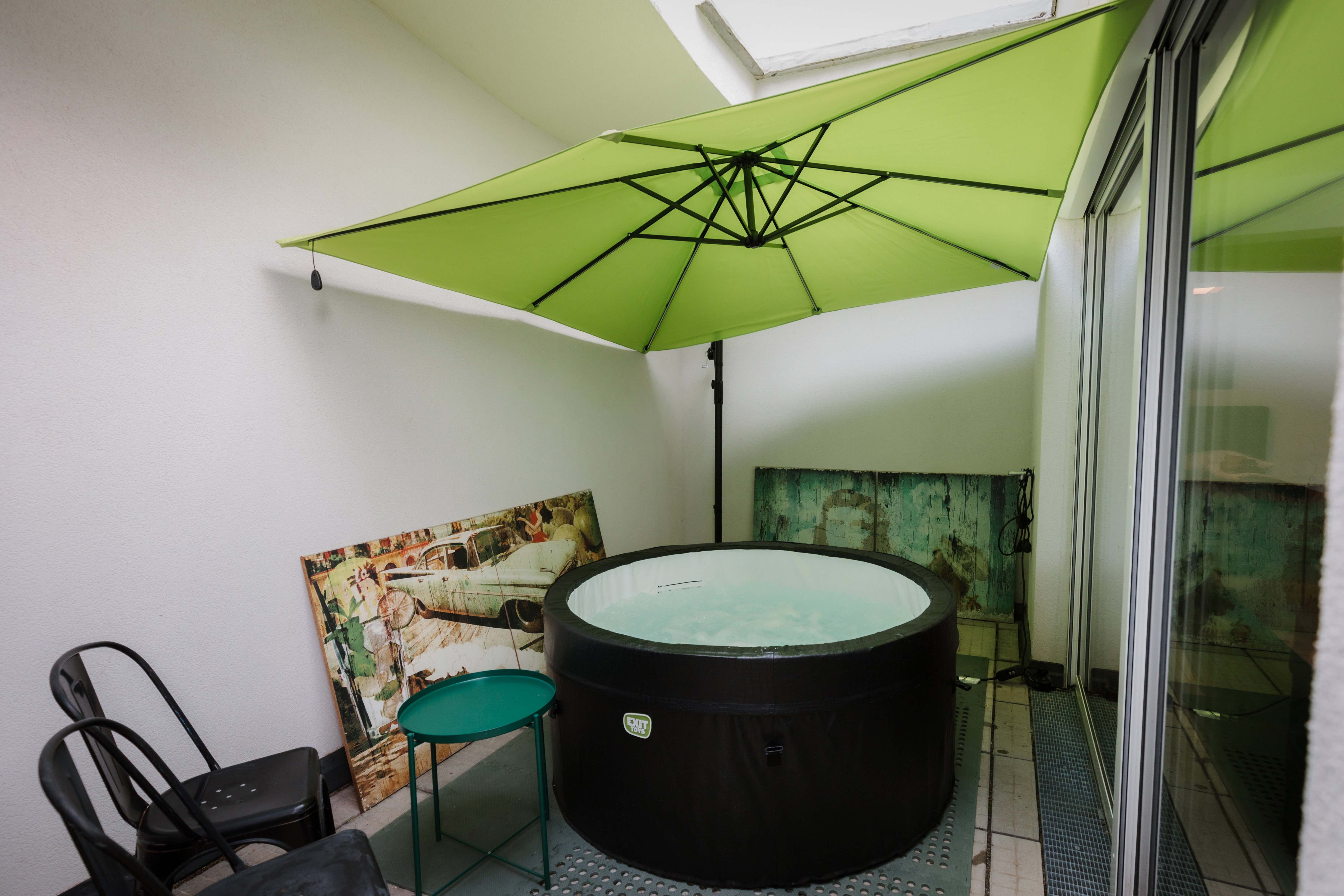 Unsere Honeymoon-Suite für zwei Personen. Entspannen Sie auf stylishen 47 m² und genießen Sie den Abend auf der großzügig gestalteten Terrasse im Innenhof, wo Sie auch ein Bad im eigenen Whirlpool nehmen können.